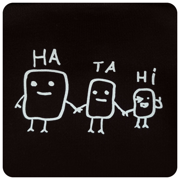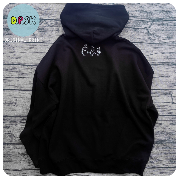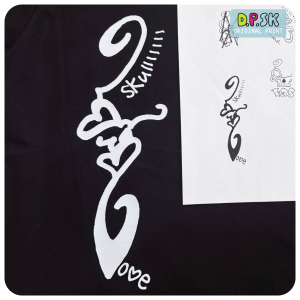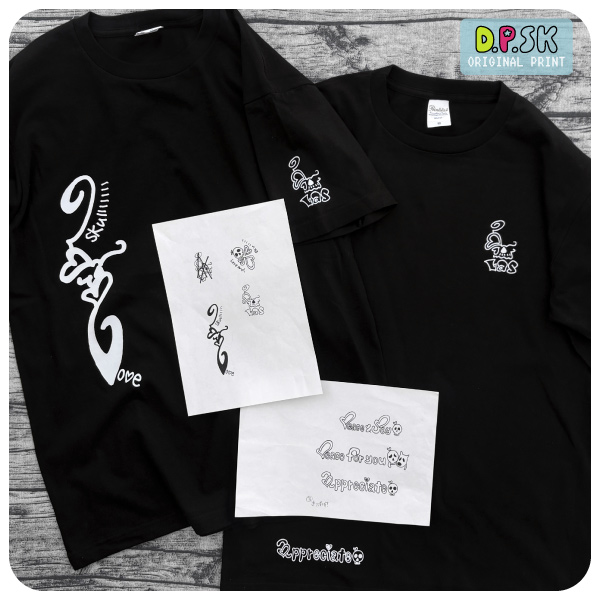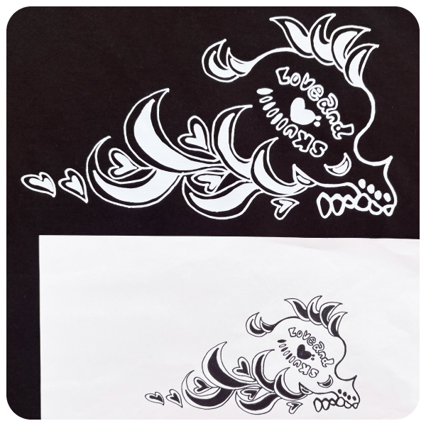 紙に黒ペンで描いた文字やイラストをご入稿いただき白でプリントしました。