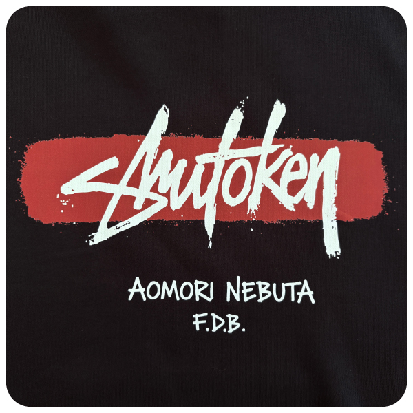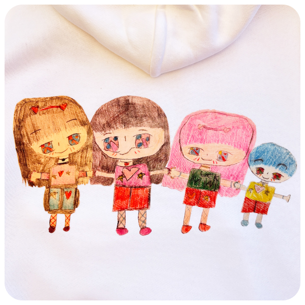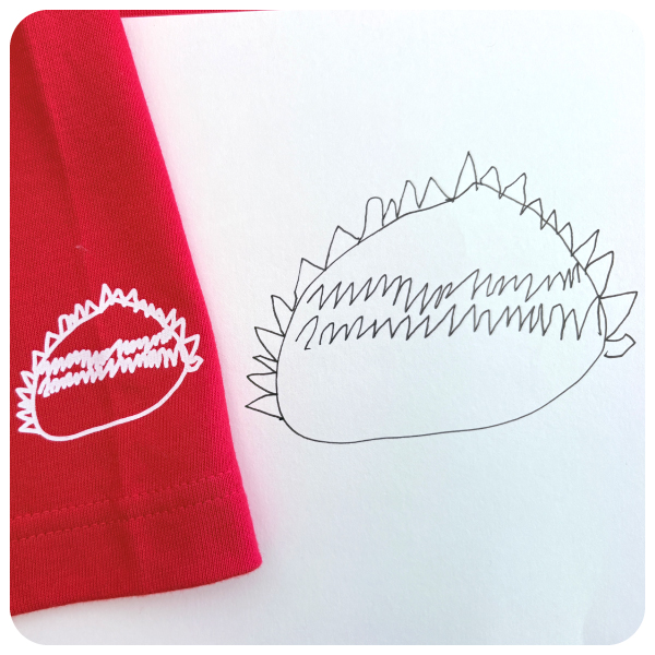 紙に黒ペンで描いた絵や文字をご郵送いただき赤Tには白でプリントしました。