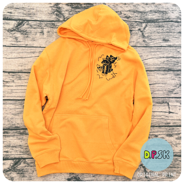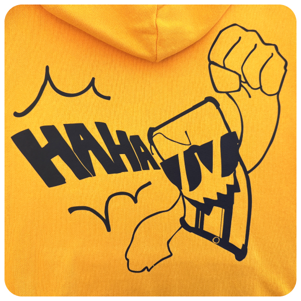 デザインシミュレーターで文字をご入稿、紙に黒ペンで描いた絵の画像をご入稿いただき白でプリントしました。