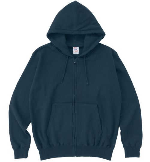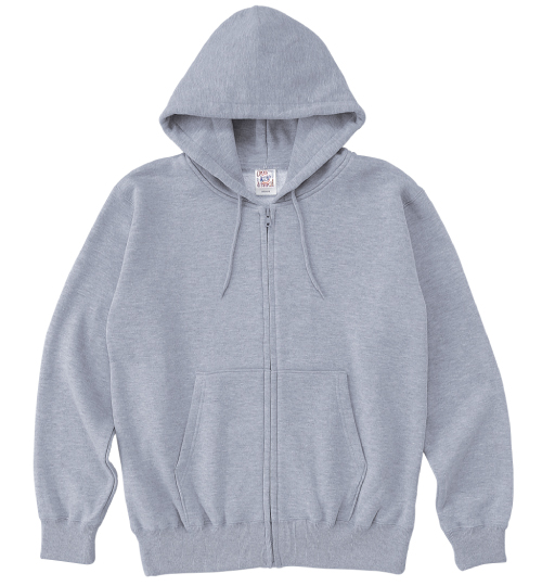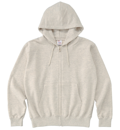 | 素材 | 10.0oz、綿100%、 (ヘザーグレーのみ綿90%,ポリエステル10%) 30/30/17裏毛(裏パイル)340g/㎡、 二重フード、ファスナーはYKK社製の生地と同系色 |